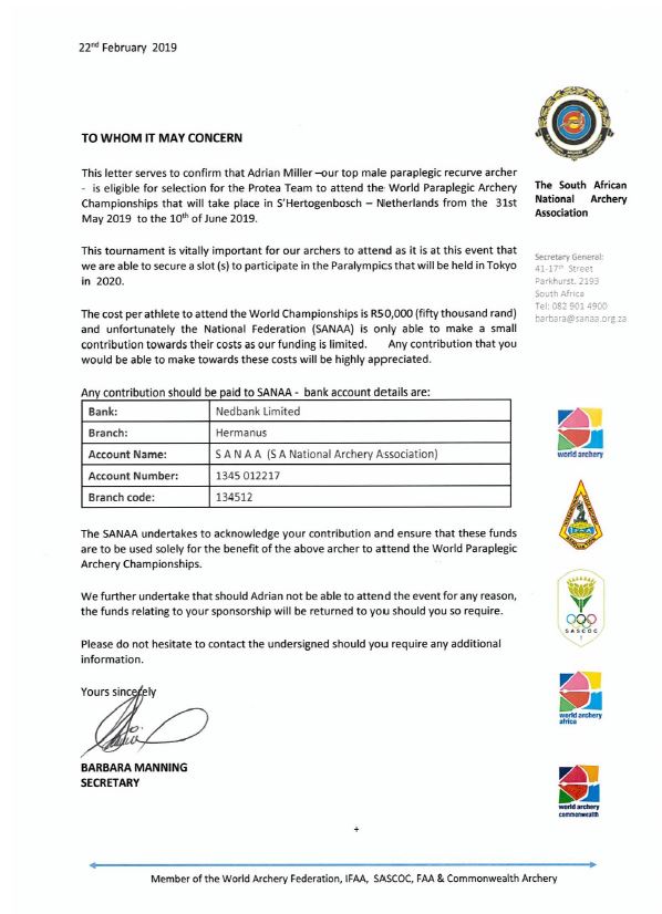 I have received an official letter from the South African National Archery association to say I am eligible for selection for the upcoming Para Archery World champs in June.